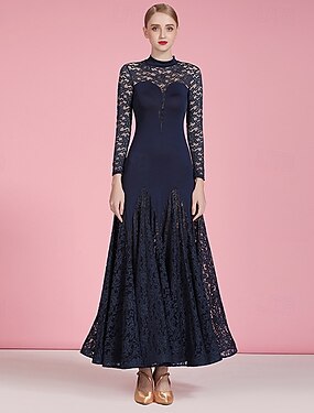 Dança de Salão Vestido Renda Pregas Mulheres Festa Treino Espetáculo Manga Longa Alto Fibra Sintética Raiom Elastano