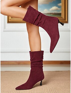 Botas femininas de camurça bordô com salto gatinho, design franzido e amarração – moda outono e inverno estilosa para ocasiões casuais e semiformais
