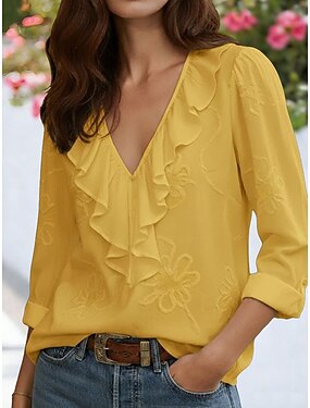 Mulheres Blusa Frufru Côr Sólida à moda Básico Casual Manga Longa Decote V Tops regulares Diário Azul Branco Amarelo Azul Marinha Verão Primavera Outono