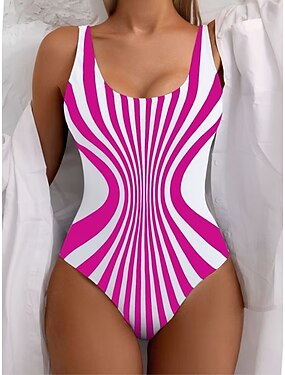Maiô Feminino de Uma Peça Emagrecido Colorblock Controle de Barriga Roupas de Banho Estampa Geométrica Listrada Vertical Decote Redondo Sem Mangas Moda Esportiva Preto e Branco Verão Praia à Beira da