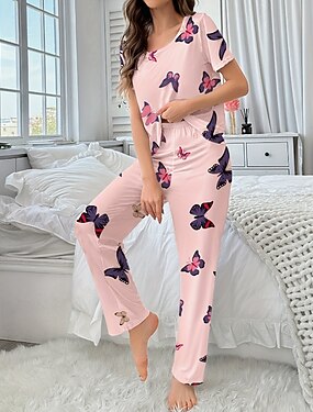 Mulheres Pijamas Loungewear Conjunto de Pijama Casual Borboleta Cintura elástica Calça Casa Diário De Cama Manga Curta Gola Redonda Rosa Verão Primavera Ajuste Largo