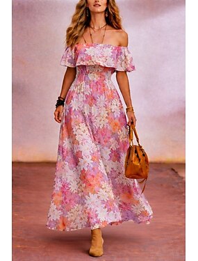 Vestido longo feminino de chiffon, modelo tubinho, estilo evasê, com babados, para férias, festa na praia, casamento, modelagem regular, estampa floral, sem mangas, ombro a ombro, rosa, arco-íris,