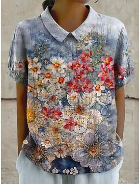 Blusa feminina com botões, estampa floral, estilo vintage, para férias, uso diário, manga curta, tecido texturizado, gola de camisa, modelo clássico, ideal para ocasiões informais, passeios, na cor