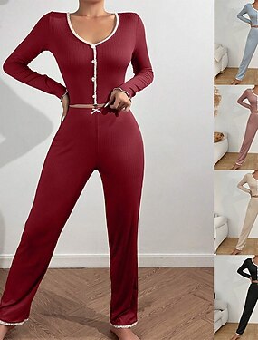 Mulheres Conjunto de Pijama Casual Conforto Cor imaculada Cintura elástica Calça Casa Diário Manga Longa Decote V Azul Preto Vinho Vermelho Cáqui Primavera Outono Fino