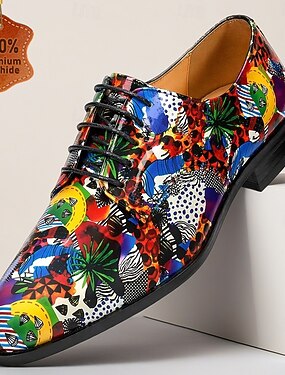 Sapatos Oxford masculinos com estampa tropical multicolorida, modelo de amarrar, um calçado ousado e marcante para convidados de casamento, banquetes, festas, formaturas e eventos noturnos de alta costura.