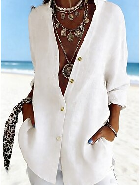 Mulheres Camisa Social Camisa casual Blusa Camisa de algodão Botões Tecido à moda Clássico Moderno Manga Longa Colarinho Chinês Tops regulares Diário Feriado Para Noite Preto Branco Vermelho Azul