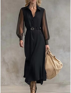 Mulheres Vestido midi Vestido preto Camisetão Vestido casual Vestido de trabalho Elegante Moda Moderno Ao ar livre Férias Para Noite Normal Tecido Manga Longa Colarinho de Camisa Preto Verão Primavera