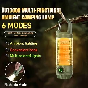 Lanterna de acampamento LED 2 em 1, com 6 modos de iluminação, luz ambiente RGB multicolorida, recarregável, portátil, com gancho para pendurar em barracas, ideal para trilhas, emergências e