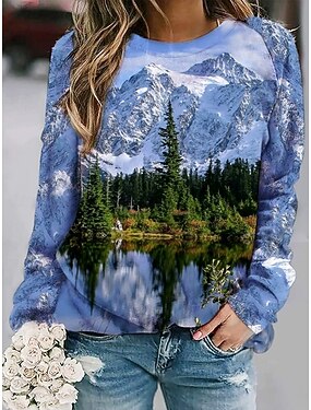 Mulheres camisolas Imprimir Gráfico Casual Manga Longa Gola Redonda Tops regulares Casual Rua Dia a Dia Azul Marron Verde Azul Claro Primavera Outono Inverno