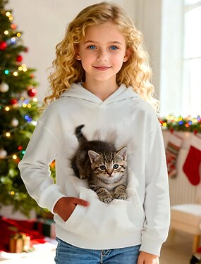 Natal Para Meninas 3D Gráfico Gato Moletom Manga Longa Outono Inverno Moda Adorável Básico Infantil 4-12 anos Com Capuz Ao ar livre Casual Diário Normal