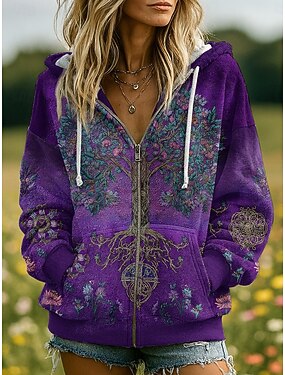 Mulheres Moletom com zíper Patchwork Zíper Bolsos Floral Gráfico Moda Casual Manga Longa Com Capuz Tops regulares Rua Dia a Dia Roxo Primavera Outono