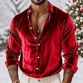 Homens Camisa Social Camisa casual Camisa de Natal Camisa de veludo Vinho Azul Royal Manga Longa Côr Sólida Tecido Colarinho de Camisa Carnaval Natal Botões Roupa Veludo Poliéster Natal Elegante