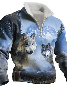 Homens Animal Lobo Tosão Moletom Moda Casual 3D Colarinho Chinês Quarter Zip Ao ar livre Férias Presente Streetwear Azul Azul 1 Azul 3# Azul 2# Half Zip Outono Inverno Designer S M L XL XXL XXXL
