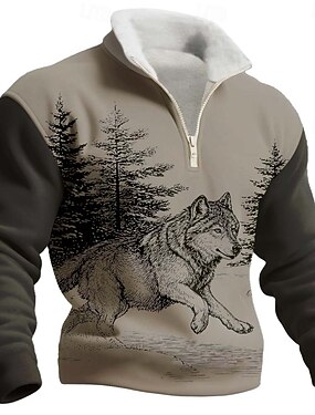 Moletom masculino retrô com estampa de lobo, zíper até o peito, estilo caça, para atividades ao ar livre, gola alta, ideal para o inverno. Disponível nos tamanhos P, M, G, GG, XGG e XXGG.