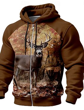 Homens Veado Moletom Caça Manga Longa Com Zíper Ao ar livre Esportes Marron Outono Todas as Estações Designer S M L XL XXL XXXL