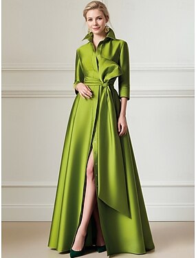 Linha A Longo Camisetão Vestido de convidada de casamento Vestido formal Vestido Para Mãe dos Noivos Meia Manga Colarinho de Camisa Minimalista Formal Convidado do casamento Outono Cetim com Laço(s