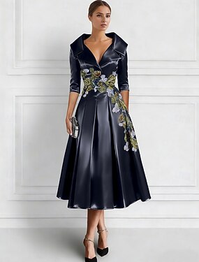Linha A Vestidos Longuette Bordado com miçangas Vestido formal Vestido para a mãe da noiva Vestidos de cocktail Vestidos de festa Elegante Vintage Meia Manga Colarinho de Camisa Formal Convidado do