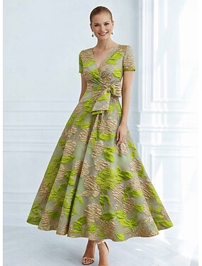 Linha A Até o Tornozelo Vestidos de cocktail Elegante Vintage Floral Manga Curta Decote V Festa de Jardim Formal Bolsos Jacquard Costas Degagê com Laço(s) Franzido