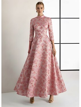Linha A Longo Vestidos de noite Elegante Vintage Manga 3/4 Gola Alta Casamento Formal Fibra Sintética Jacquard com Estampa floral Bolsos