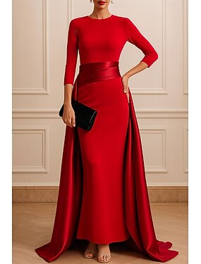 Tubinho Longo Vestidos de noite Vestido de baile com sobressaia Elegante Split alta Manga 3/4 Gola Redonda Casamento Formal Crepe Esticado com Pregas