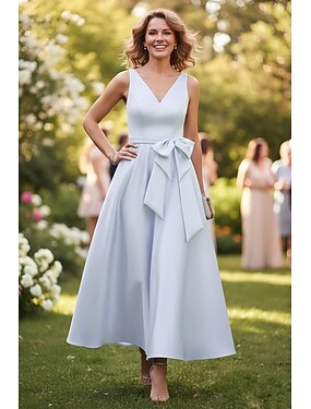 Linha A Até o Tornozelo Vestido de festa Vestido Coquetel Vestido de convidada de casamento Vestido Para Mãe dos Noivos Sem Manga Decote V Elegante Simples Convidado do casamento Semi formal Cetim com