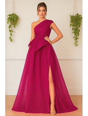 Linha A Longo Vestidos de baile Vestidos de noite Elegante Estilo Celebridade Sem Manga Assimétrico Baile de Formatura Formal Organza com Franzido Fenda