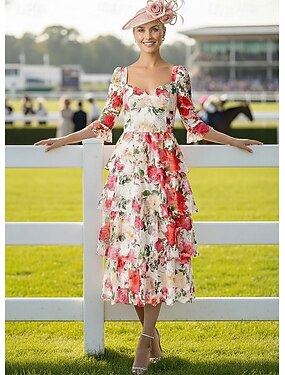 Linha A Até o Tornozelo Vestido A Line Vestido floral Vestidos de cocktail Vestidos de festa Elegante Vintage Meia Manga Decote V Casamento Formal Jacquard com Tulipa Bolsos