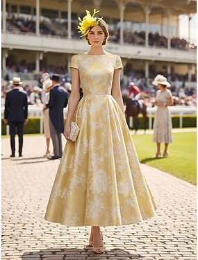 Linha A Longuette Vestidos de cocktail Vestidos para convidadas de casamento Elegante Manga Curta Decote Canoa Festa de Jardim Formal Cetim Renda com Estampa floral Pregas Franzido