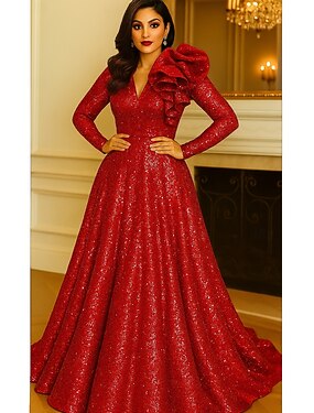Linha A Longo Vestidos de noite Vestido de Baile Elegante Brilhante Manga Longa Decote V Casamento Formal Bolsos Paetês com Purpurina