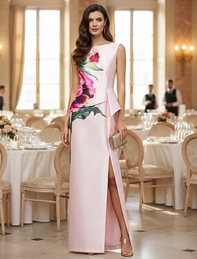 Linha A Até o Tornozelo Vestido de convidada de casamento Vestido de Derby Vestido Para Mãe dos Noivos Sem Manga Gola Redonda Elegante Vintage Formal Kentucky Derby Cetim com Estampado