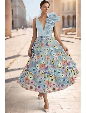 Linha A Longuette Vestidos de cocktail Elegante Vintage Floral Sem Manga Decote V Festa de Jardim Casamento Bolsos Cetim Renda com Flor bordada Bordado Bolsos