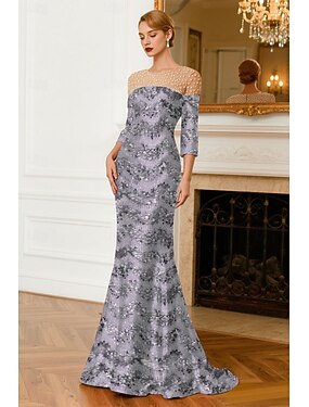 Vestido de Festa em Lurex Stretch Mermaida Trompete Elegante Vestido Formal de Casamento com Cauda Sweep Brush Longa com Manga Longa Decote Redondo Jersey com Pregas de Glitter Franzido