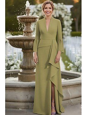 Tubinho Longo vestido de cetim Vestido de convidada de casamento Vestido formal Vestido Para Mãe dos Noivos Manga Longa Decote V Elegante Simples Formal Convidado do casamento Cetim com Pregas Fru-Fru
