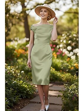 Tubinho Até os Joelhos Vestido de festa Vestido Coquetel Vestido de convidada de casamento Vestido Para Mãe dos Noivos Sem Manga Ombro a Ombro Elegante Formal Kentucky Derby Cetim com Franzido