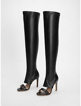 Botas femininas pretas acima do joelho de couro sintético com salto grosso - botas altas e elásticas estilosas para streetwear de outono/inverno, festas e saídas à noite