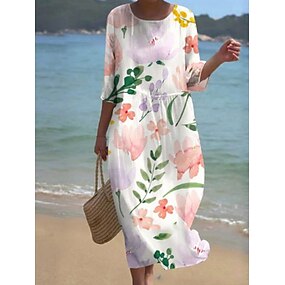 Mulheres Vestido midi Vestido casual Vestido estampado Moda Moderno Diário Praia Final de semana Normal Floral Manga 3/4 Gola Redonda Branco Rosa Roxo Claro Roxo Primavera Outono