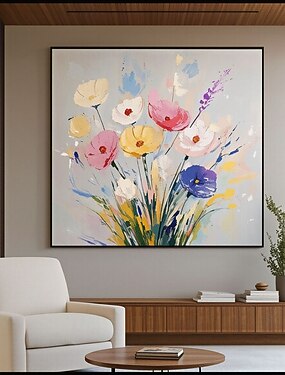 Pintura a óleo abstrata colorida com textura de flores, pintada à mão sobre tela, grande formato, arte de parede original minimalista com tema floral, decoração personalizada para sala de estar.