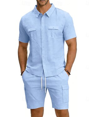Homens Camisa de linho 2 Peças Conjunto de camisa E Bermuda Cargo Calção Shorts de linho Definir Tecido Diário Ao ar livre Férias Aberto para a Lateral Manga Curta Verão Moda Casual Confortável Roupa