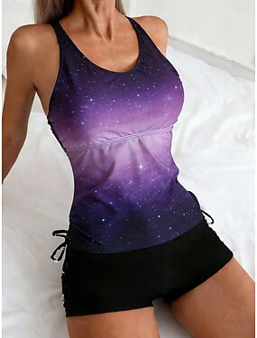 Maiô Feminino de Tankini em 2 Peças com Corte Boy Leg Sem Costas Praia de Férias Ombre Decote U Sem Mangas