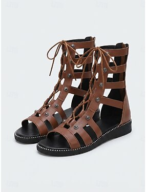 Sandálias gladiadoras femininas com tachas – sapatos rasos estilo romano com tiras e amarração, ideais para cruzeiros, viagens à praia e looks de verão.