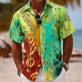 Homens Colorido Notas musicais Camisa Social camisa de botão Manga Curta Vintage retrô Diário Festival de Música Primavera Outono Aberto para a Lateral Impressão 3D camisas de colarinho Azul Rosa