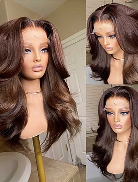 Peruca de cabelo humano virgem brasileiro 100%, com fecho de renda 5x5 e frontal de renda 13x4, nas cores preto e castanho escuro, com baby hair, linha capilar natural e sem cola. Ideal para mulheres.
