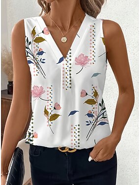 Mulheres Malha Íntima Floral Gráfico Plantas Elegante Vintage à moda Sem Manga Decote V Tops regulares Diário Branco Rosa Verão Primavera
