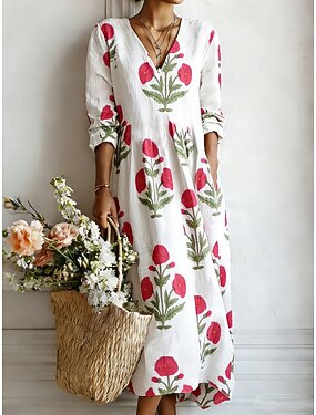 Mulheres Vestido midi Vestidos Para o Verão Vestido A Line Férias Casual Boho Feriado Normal Floral Gráfico Manga Longa Decote V Azul Amarelo Vermelho Verão Primavera