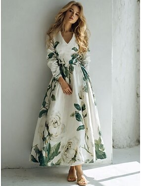 Mulheres Vestido midi Vestido A Line Vestido justo e evasê Férias Casual Normal Floral Gráfico Manga Longa Gola Redonda Rosa Verde Bege Verão Primavera