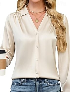 Mulheres Camisa Social Blusa de cetim Saia camisa de botão Côr Sólida Tecido Elegante Moda Casual Manga Longa Aberto para a Lateral Decote V Tops regulares Diário Trabalho Para Noite Azul Vermelho