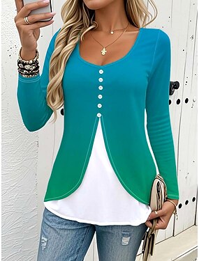 Mulheres Camiseta Botões Imprimir Em Camadas Gráfico Gradiente Vintage à moda Clássico Manga Longa Gola Redonda Tops regulares Diário Azul Vermelho Verde Primavera Outono Inverno