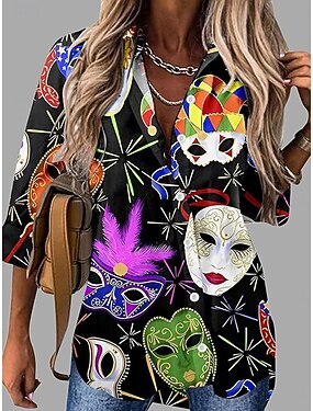 Mulheres Camisa Social Botões Imprimir Gráfico Vintage Diário Casual Manga Longa Decote V Tops regulares Diário Feriado Preto Primavera Outono