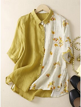 Camisa Feminina Linho Semelhante Respirável Leve Camisa Tunica Botão com Colarinho Manga Longa Floral Gráfico Diários Estilosa Casual Tops Regulares Diários Feriado Impressão Amarelo Azul Roxo Verde