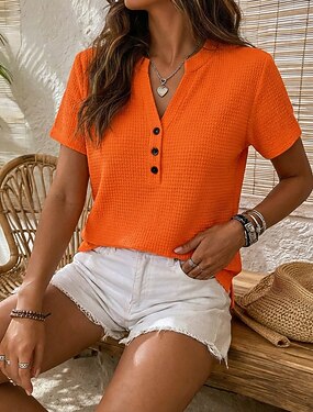 Mulheres Camisa Social Camisa Waffle Vintage à moda Sem Manga Manga Curta Decote V Tops longos Diário Trabalho Feriado Laranja Verão Primavera